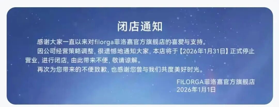 近日,法国院线护肤品牌Filorga菲洛嘉官方旗舰店发布公告称,由于公司经营策略调整,店铺将于2026年1月31日正式停止运营并闭店。