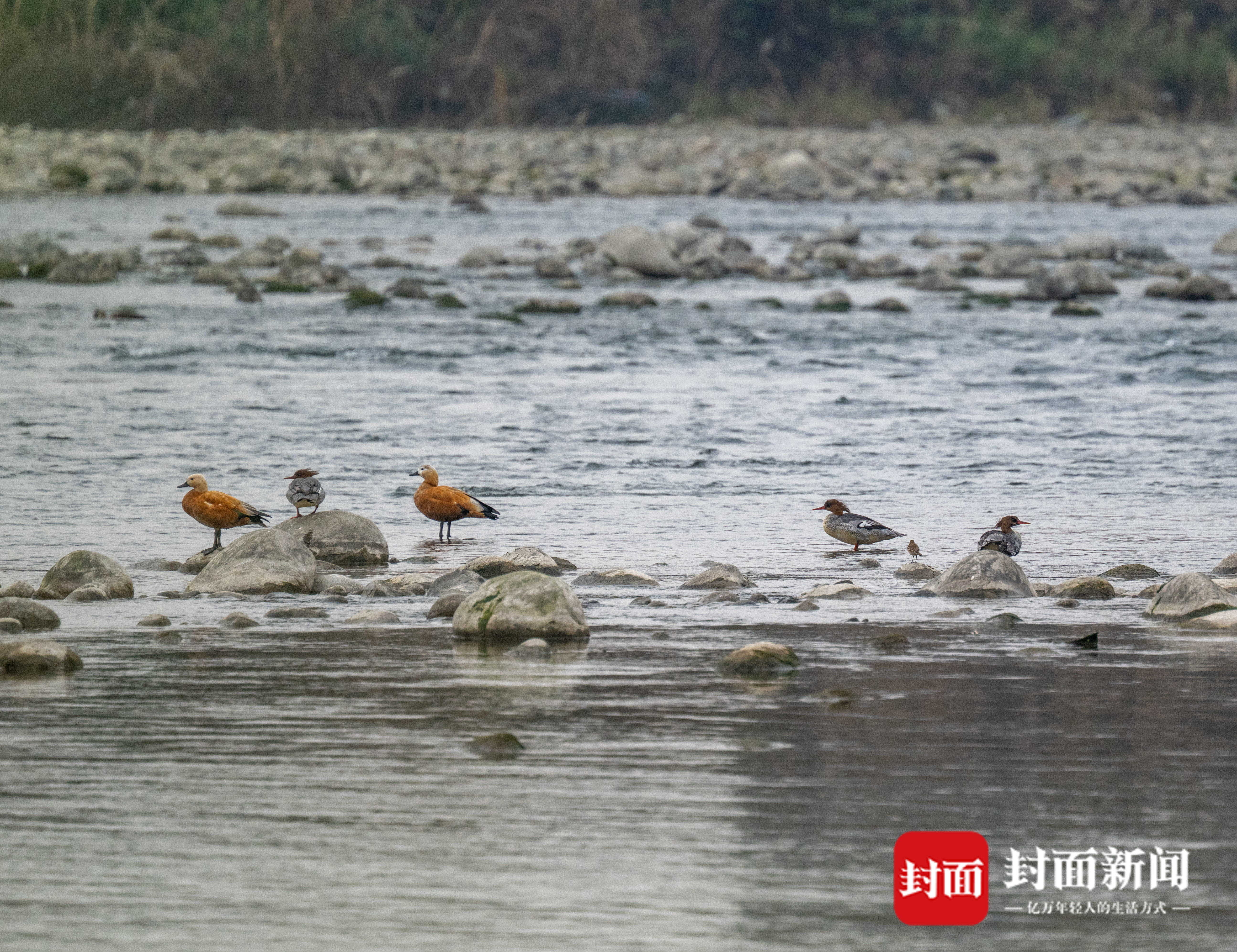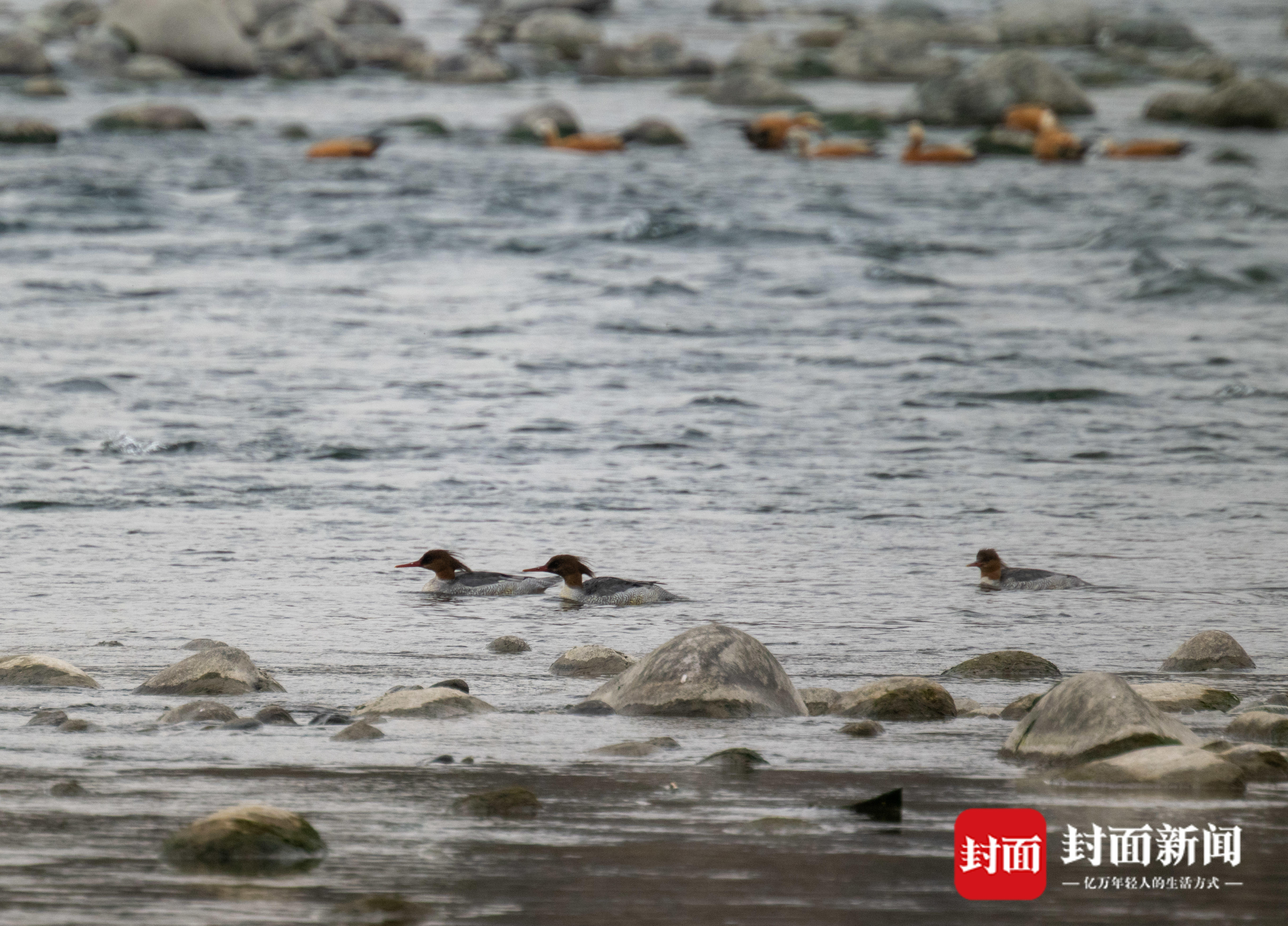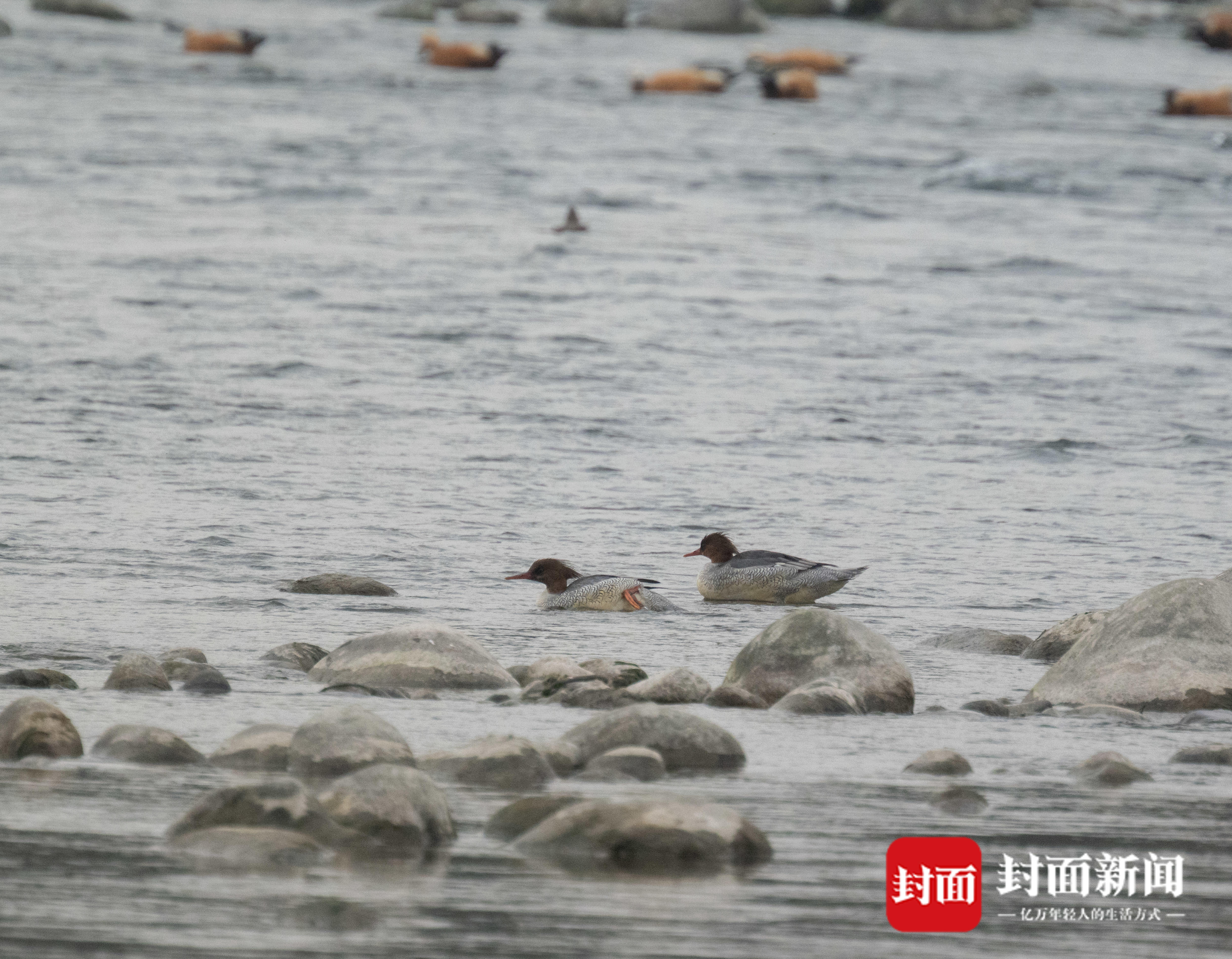 2025年12月23日,成都都江堰外江某河段,中华秋沙鸭和赤麻鸭在水中休憩。