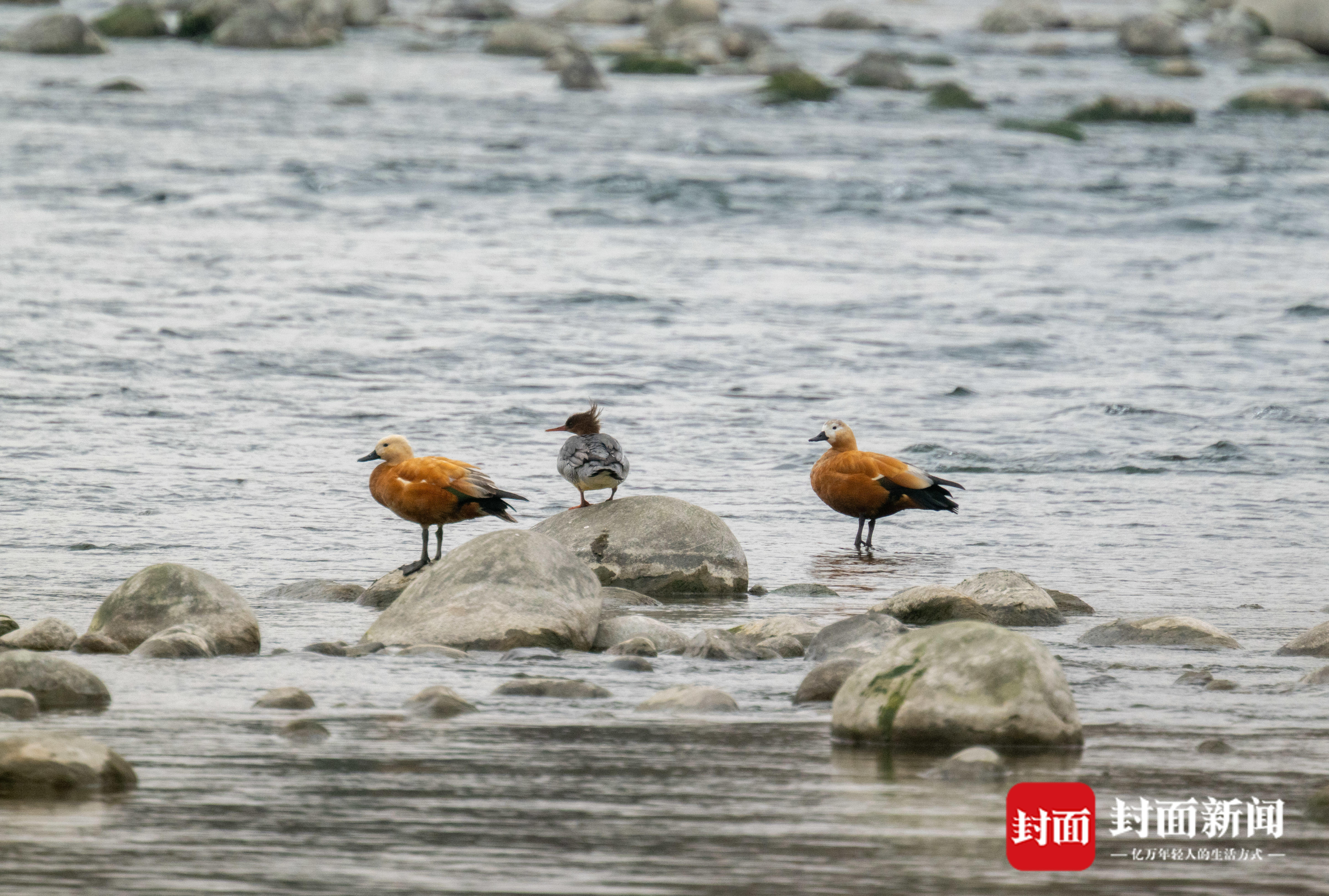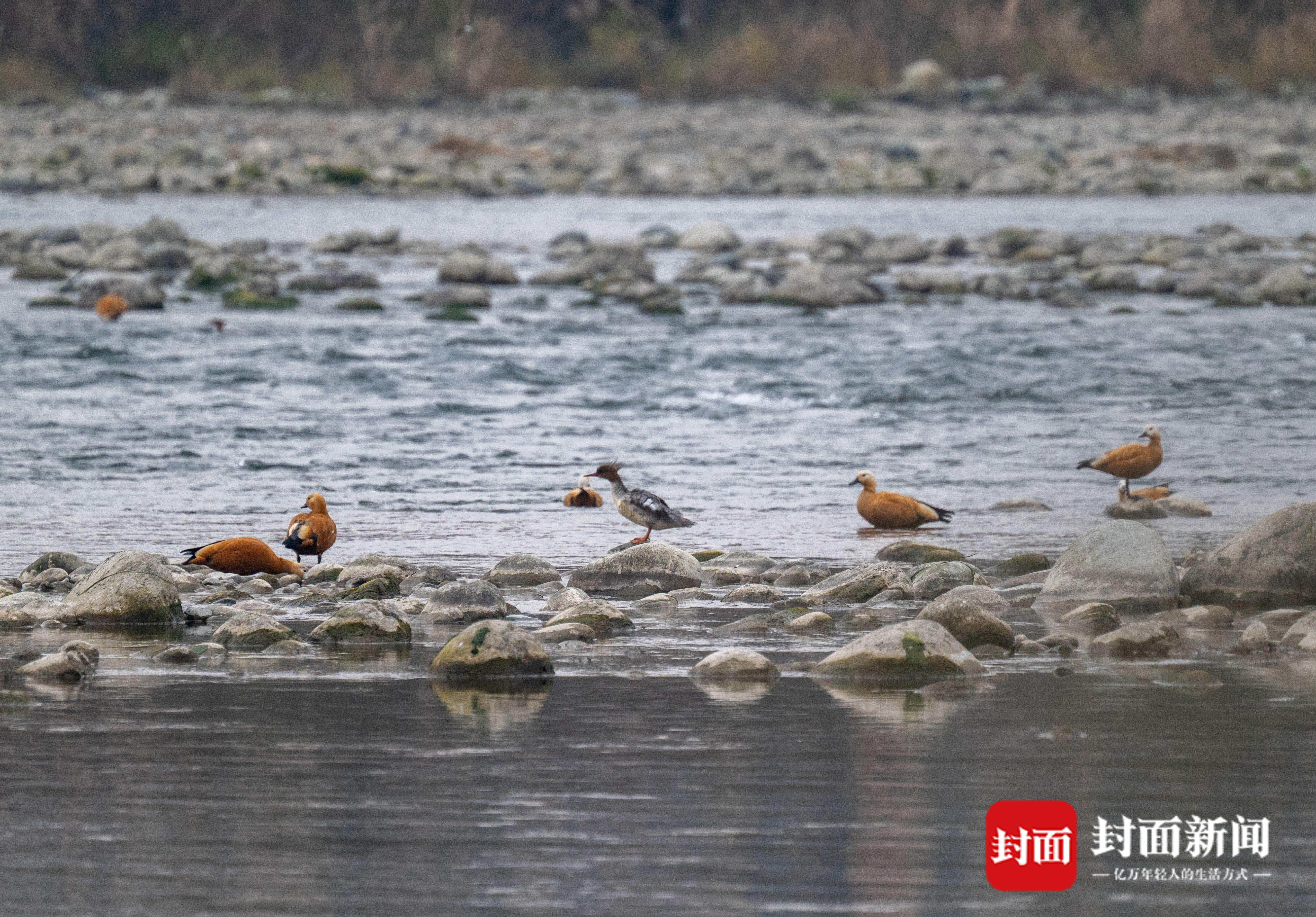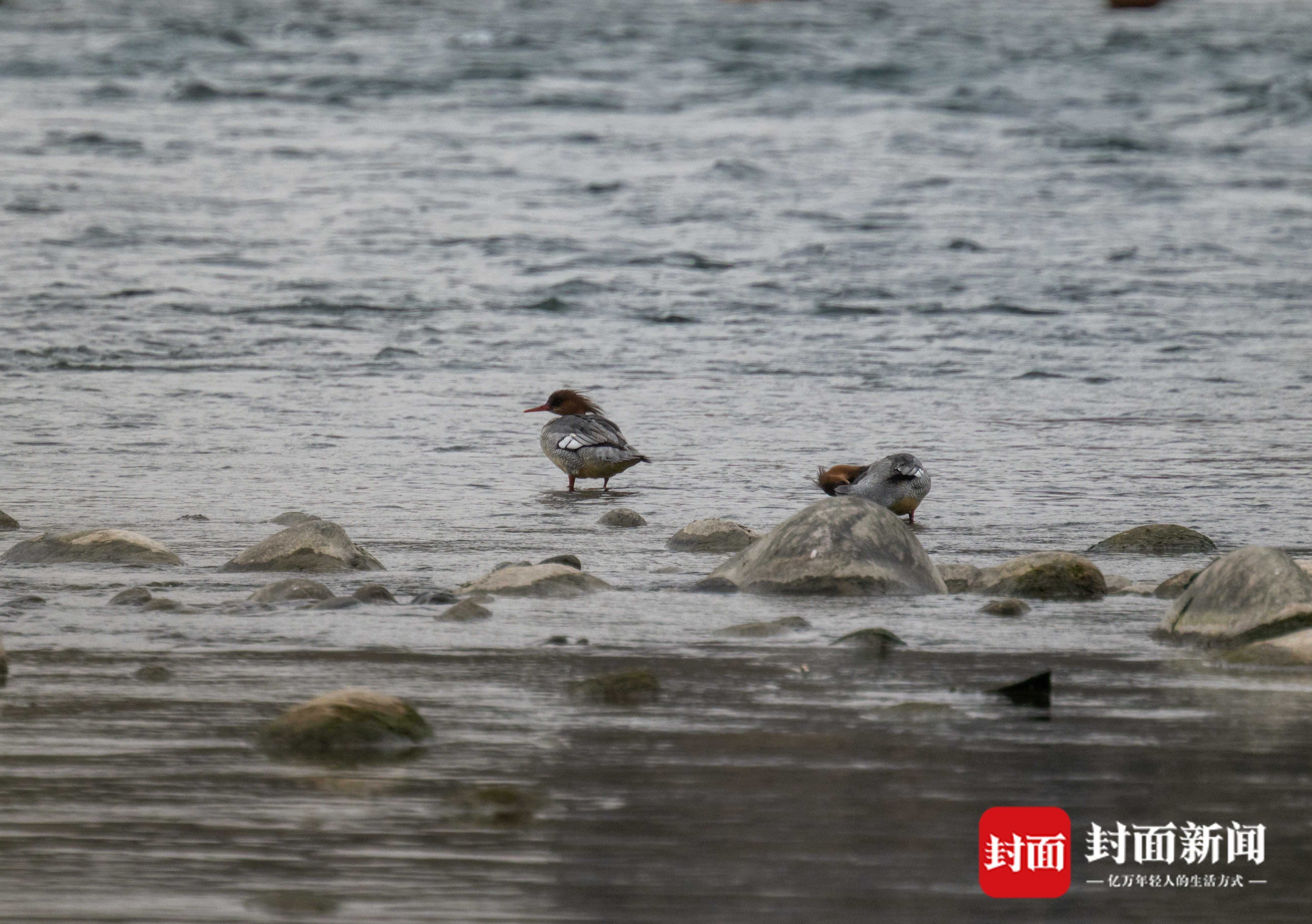 2025年12月23日,成都都江堰外江某河段,中华秋沙鸭和赤麻鸭在水中休憩。